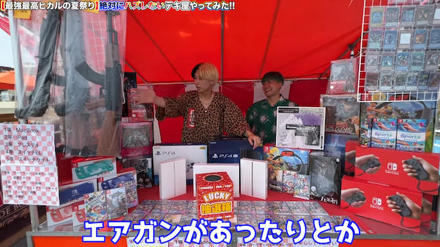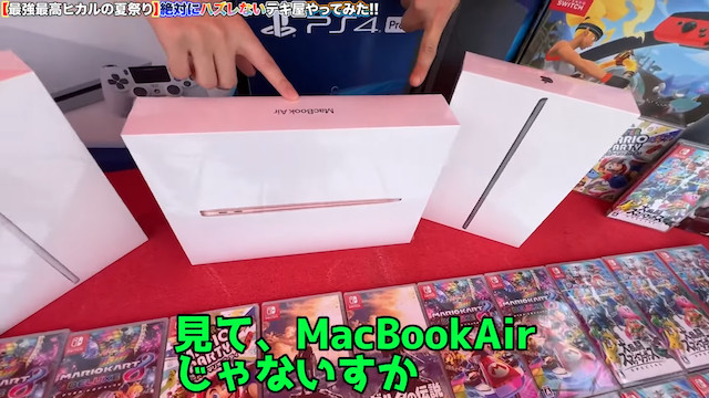 しかし、今回は逆の立場で、くじ引きを主催する側に回ったヒカル。動画の冒頭には「テキ屋を破壊してしまったから、逆に復興する」と宣言し、無料のくじ引きを実施。全てが当たりとなんとも豪華な内容となっており、MacBookやニンテンドースイッチ、PS4など総額200万円を超える景品を用意した。